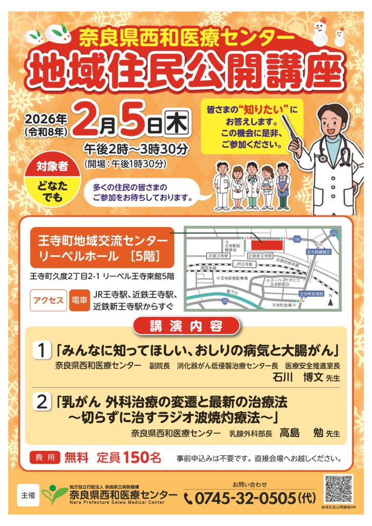 令和8年2月5日(木)14時より王寺町地域交流センター5階リーベルホールにて西和医療センター地域住民公開講座を開催いたします。