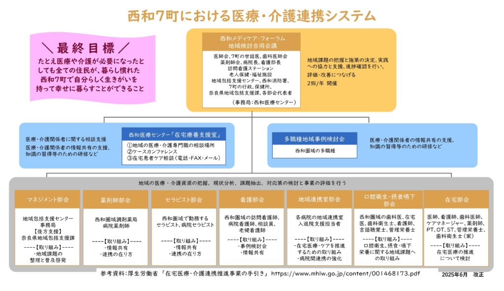 西和メディケア・フォーラムは、西和7町(平群町・三郷町・斑鳩町・安堵町・上牧町・王寺町・河合町)における医療と介護連携を推進するための事業として2014年に立ちあがり、地域包括ケアシステムの推進に関わる医療・介護・福祉・行政の関係機関で組織されています。西和地域にお住いの皆さまが、住み慣れた地域で自分らしい生活を送っていただけることを目的に、地域の課題やニーズについて話し合い、関係職種が連携・協働して様々な取り組みを行っています。